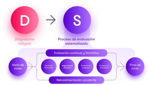 El modelo de Riverstone Solution permite diseñar una estrategia de evaluación personalizada que integra recursos, pruebas y un seguimiento constante del progreso del alumno.